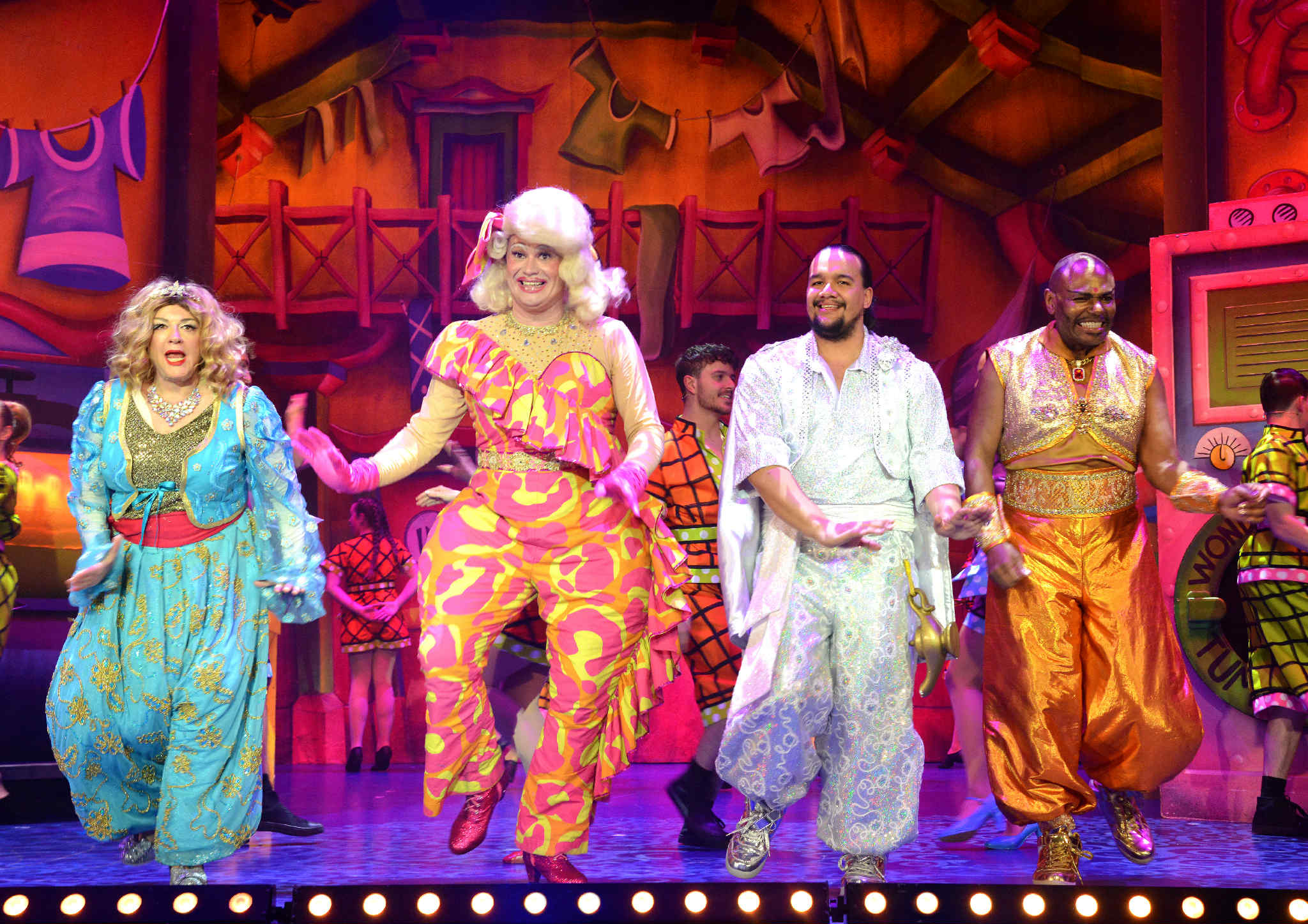 Returning for a second year, Cleve September goes from playing a prince to Aladdin with a refreshing and impressive shift. Trading regal polish for a more down-to-earth, street-smart hero allowed Cleve to show a different side of his performance, bringing warmth, relatability, and cheeky charm to the role. It was also great to see more of him on stage, giving him the opportunity to truly show off his commanding stage presence, impressive dancing skills, and above all his powerful vocals. Each solo he was given suited him perfectly, allowing his voice to shine and adding real impact to the production, further cementing him as a standout performer throughout the pantomime. Joining him on stage were his Dame mother, Widow Panky, and brother Franky Panky, played by Jason Marc-Williams and Rikki Jay, who together formed a fantastic partnership along with some solo moments that were packed with perfectly timed comic moments. Jason, in particular, dazzled as the Dame, delivering a parade of stunning outfits, each one more outrageous and impressive than the last all while fully embracing the larger-than-life spirit of the role. Rikki had the audience engaged and involved from the very moment he stepped on stage, effortlessly leading the call-and-response moments that make panto so special. Together, they ensured everyone felt part of the fun, just as true panto performers should, peppered with brilliant one-liners and off-script puns that had even their fellow cast members struggling not to laugh.